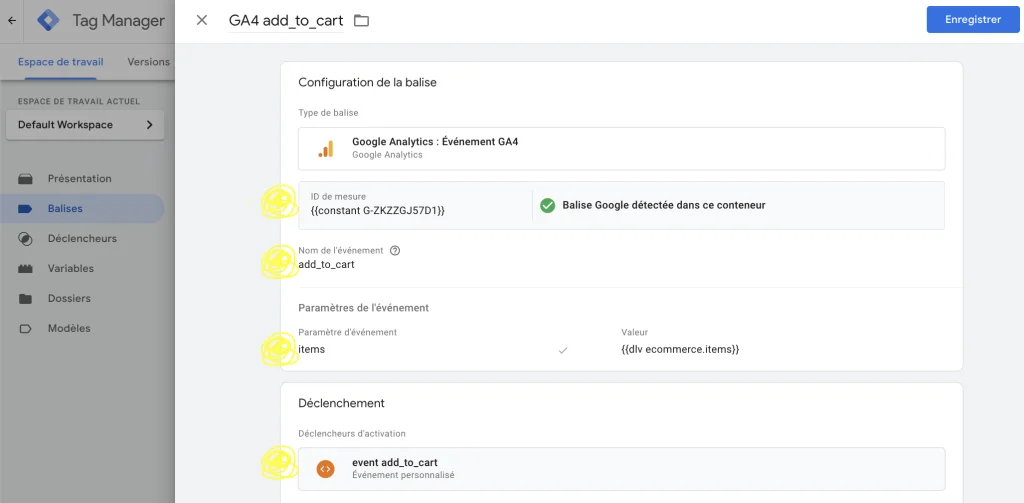 Lors de la configuration d’une balise événement GA4 dans GTM pour un événement e-commerce, tu peux référencer la variable “items” que tu as configurée pour inclure les informations sur les produits dans l’événement. Dans les paramètres de la balise, sous “Paramètres de l’événement”, tu ajouterais un paramètre nommé “items” et lui attribuerais la variable créée précédemment.