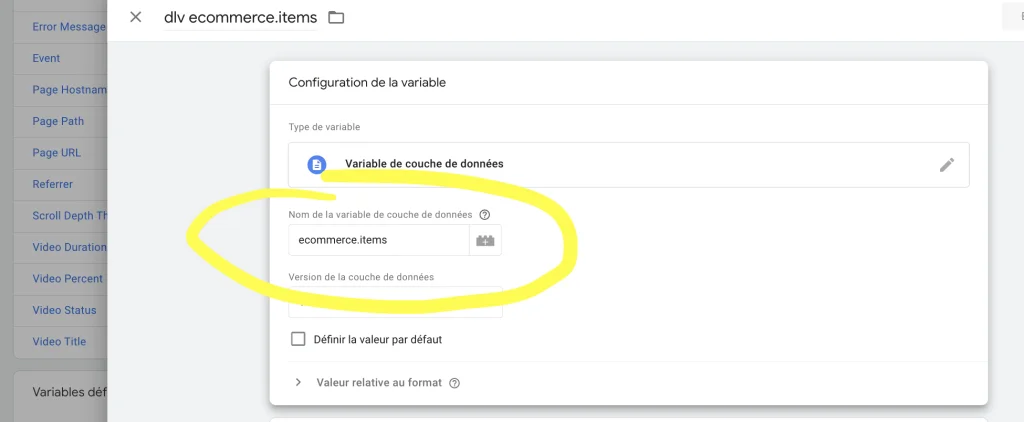- Dans le champ “Nom de la variable de couche de données”, saisis “ecommerce.items” ou le chemin approprié vers le tableau “items” dans ta structure de Data Layer.