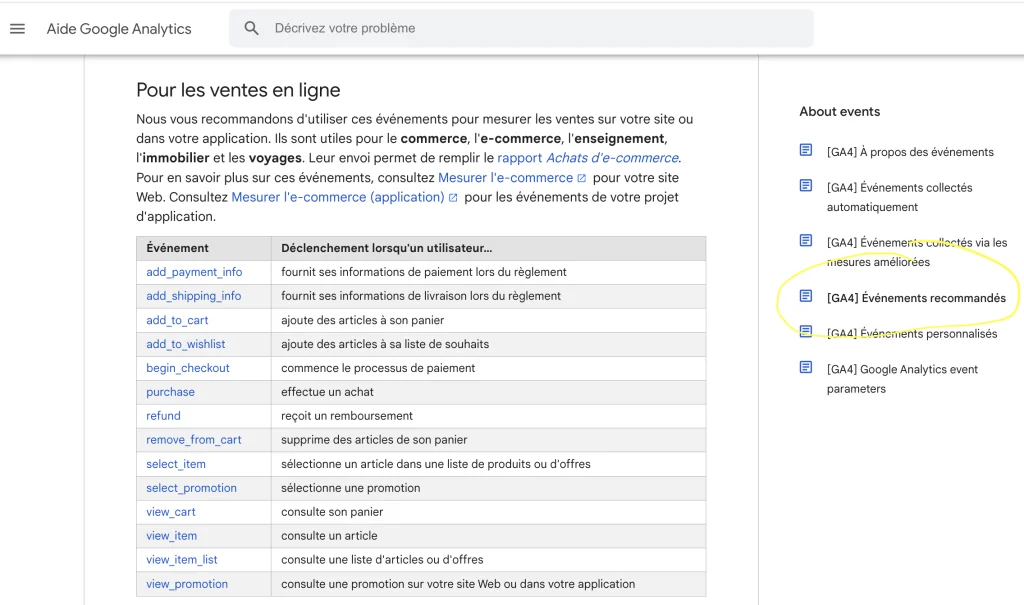 Pour une liste complète des événements recommandés et des paramètres pris en charge, je te recommande de consulter la documentation officielle de Google sur les événements recommandés pour toutes les propriétés et de te référer à la documentation pour les développeurs pour la mise en œuvre de ces événements.