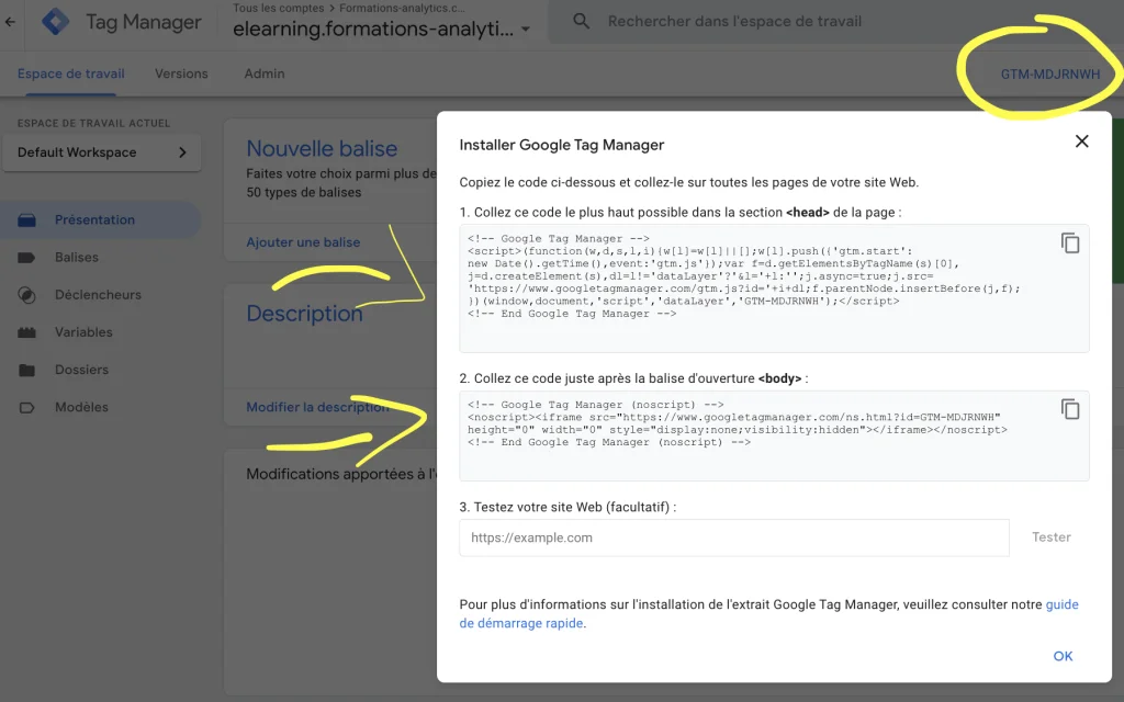 - Code Snippet : GTM te fournira deux morceaux de code. Le premier snippet doit être copié et collé dans les balises