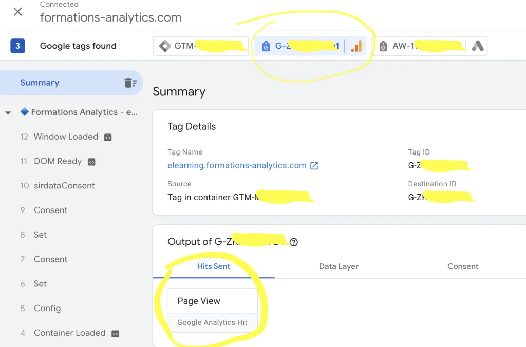 - Naviguer dans le mode de prévisualisation de GTM : Une fois que tu as connecté ton site au Tag Assistant, tu verras un petit popup dans le coin inférieur droit de ta fenêtre indiquant que le débogueur est connecté. Tu peux voir un résumé de toute la session dans l’onglet Tag Assistant, y compris toutes les balises qui ont été déclenchées et les valeurs actuelles de la Data Layer.